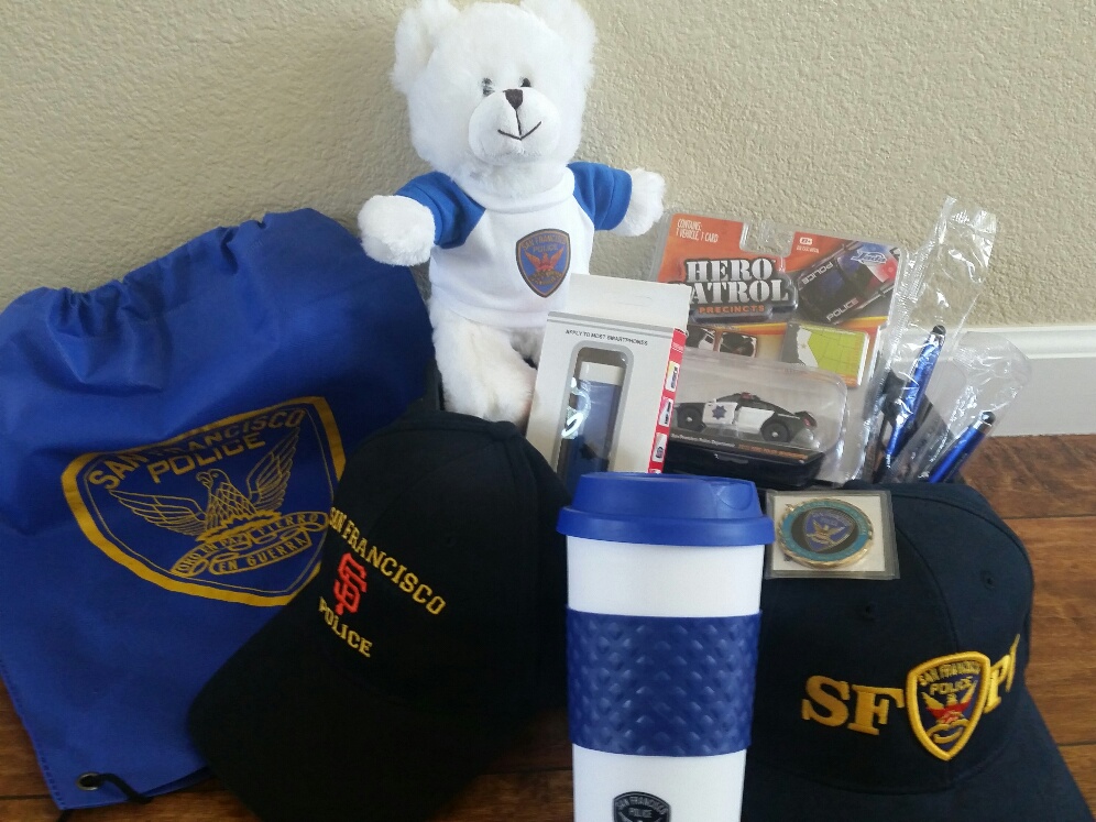The coolest SFPD gear which includes: SFPD teddy bear, external power bank, SFPD emblem, 2 hats, tumbler, pins, bag, toy car, and pen.