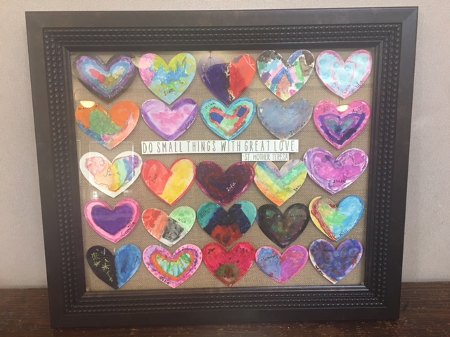 A tribute to St. Mother Teresa: her words surrounded by individually colored hearts